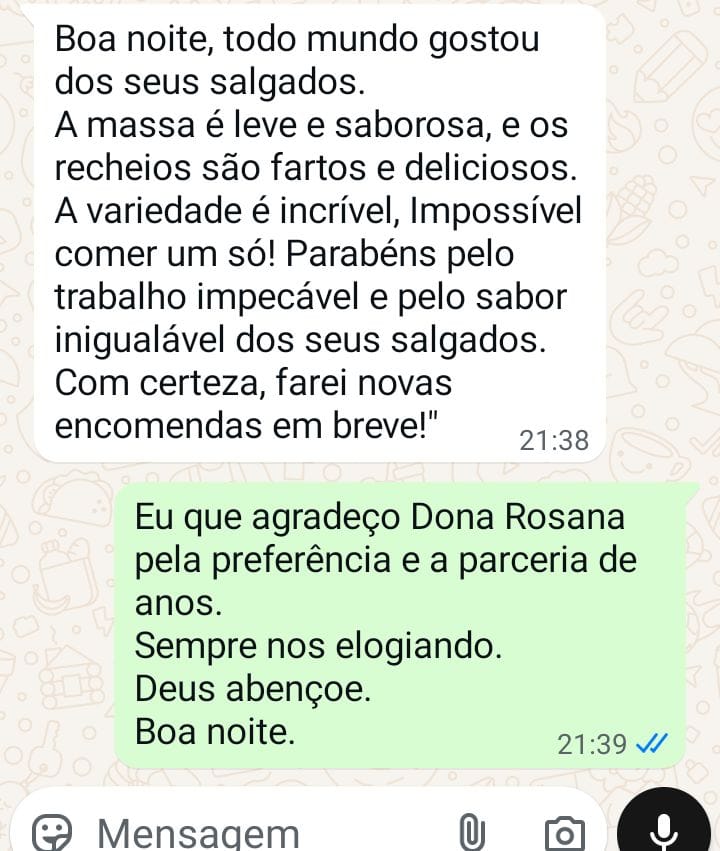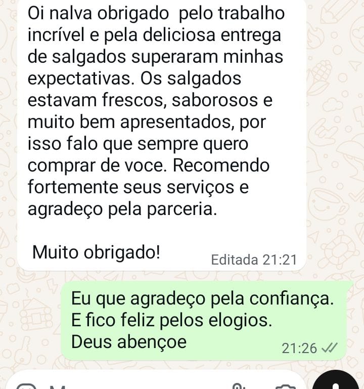 Venha ser mais um experimentando a explosao de sabores que só os nossos salgados podem proporcionar, e deixe seus convidados ou clientes com água na boca com a nossa variedade de produtos irresistíveis!